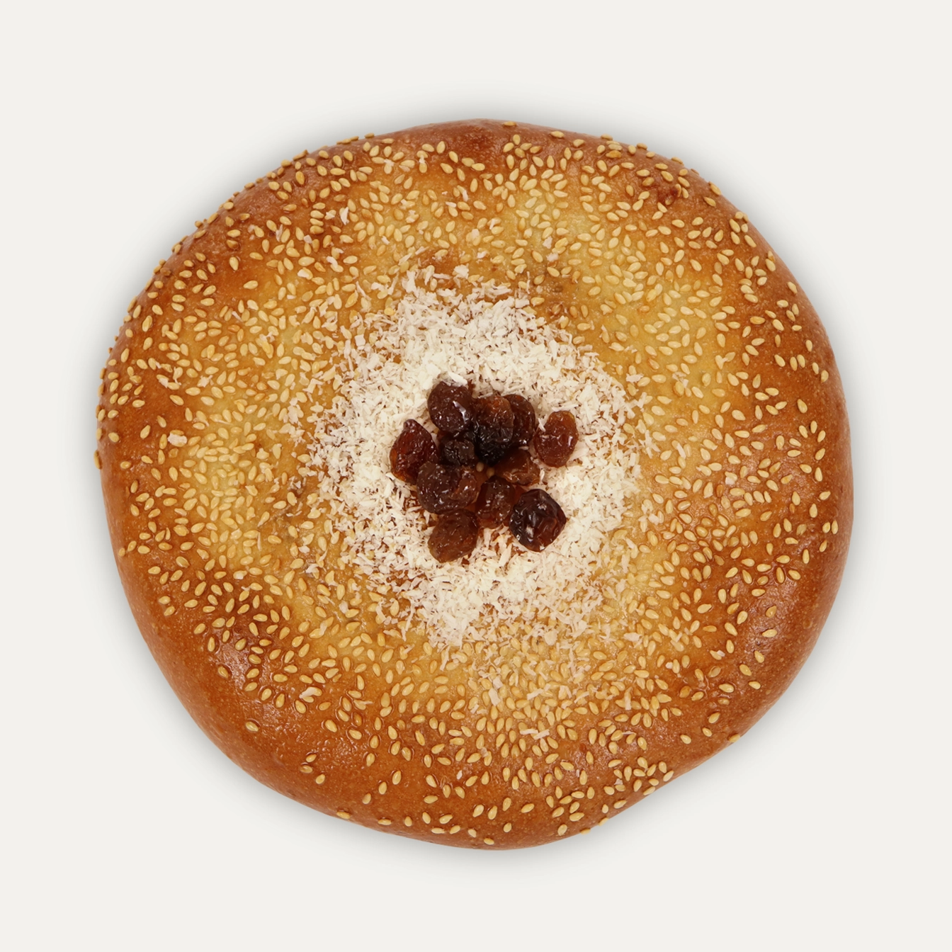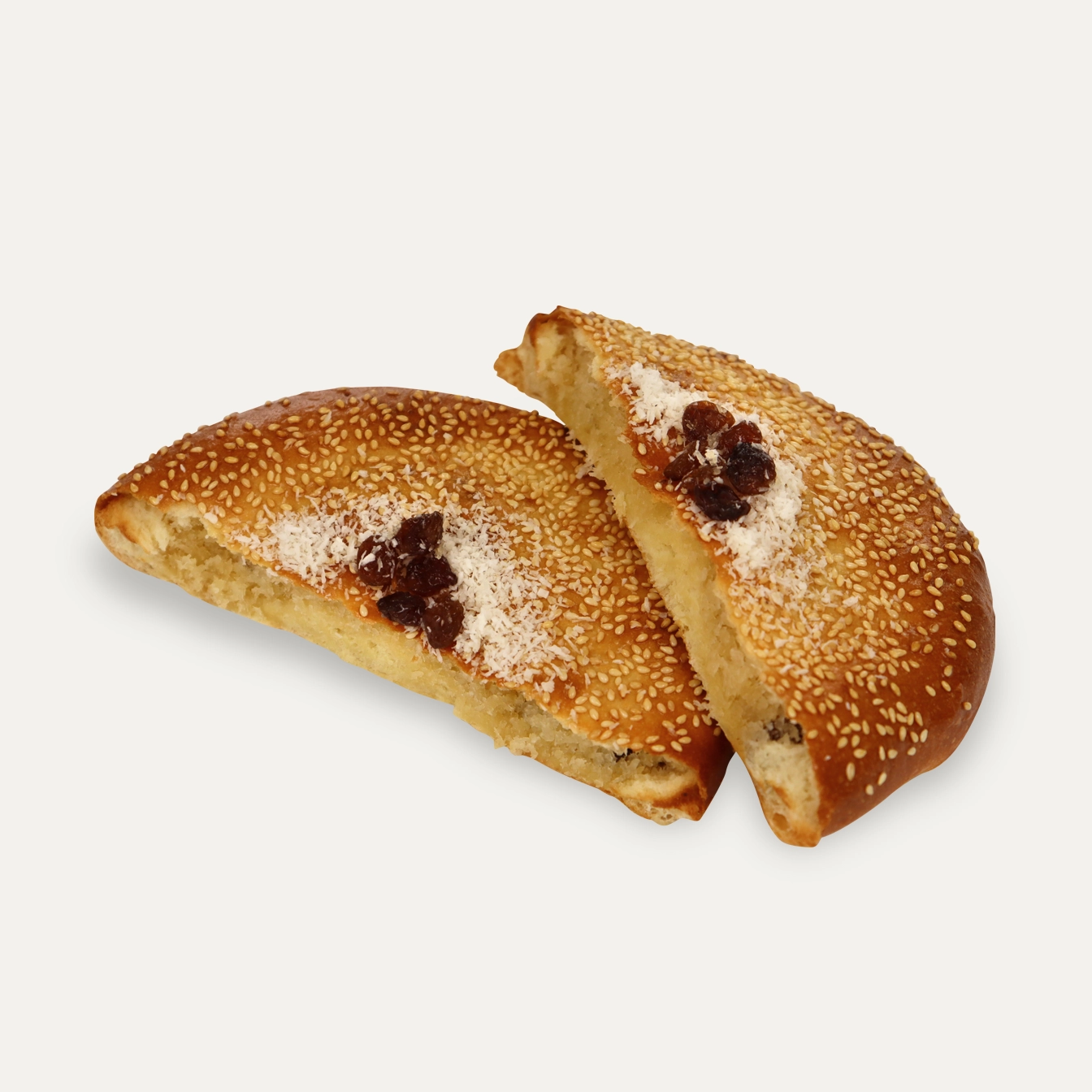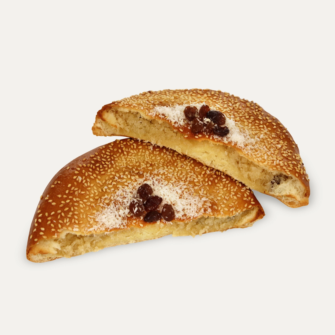 Soft dough made with clarified butter, filled with coconut flakes and raisin pieces, topped with sesame, coconut flakes and raisins.