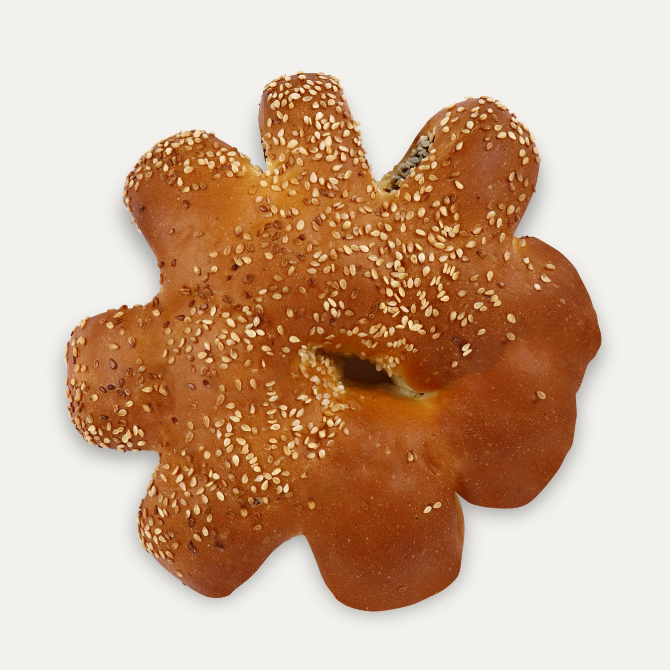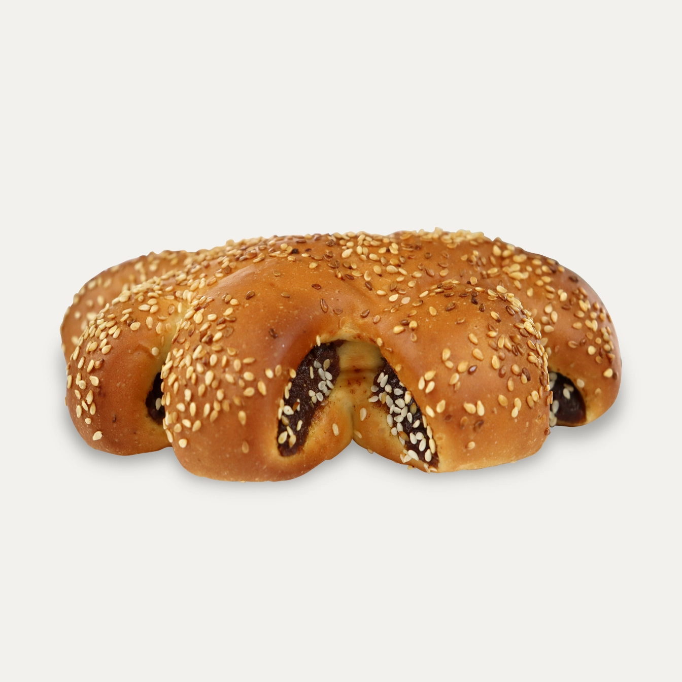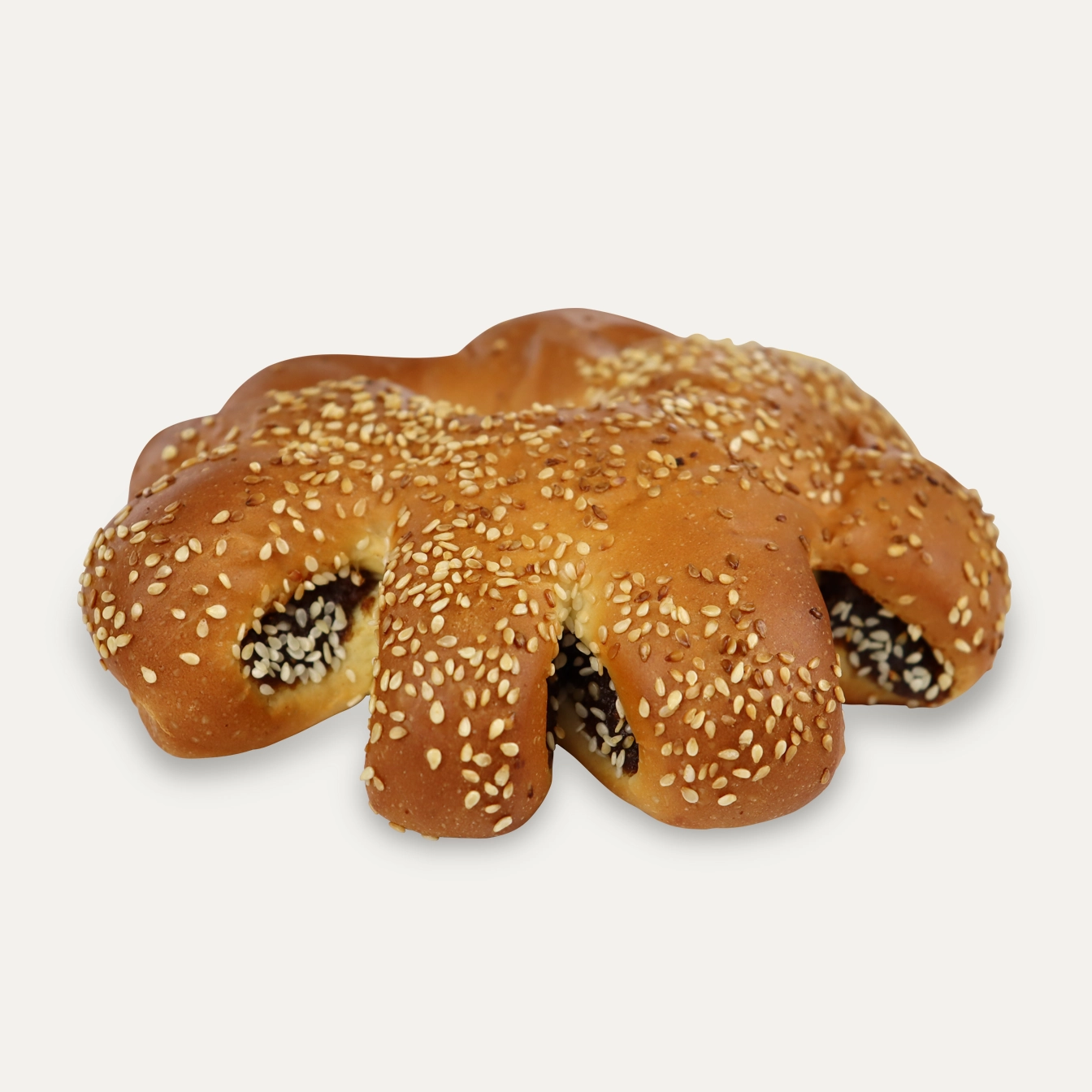 Soft dough made with clarified butter, filled with sweet date paste and cardamom, topped with fine sesame.