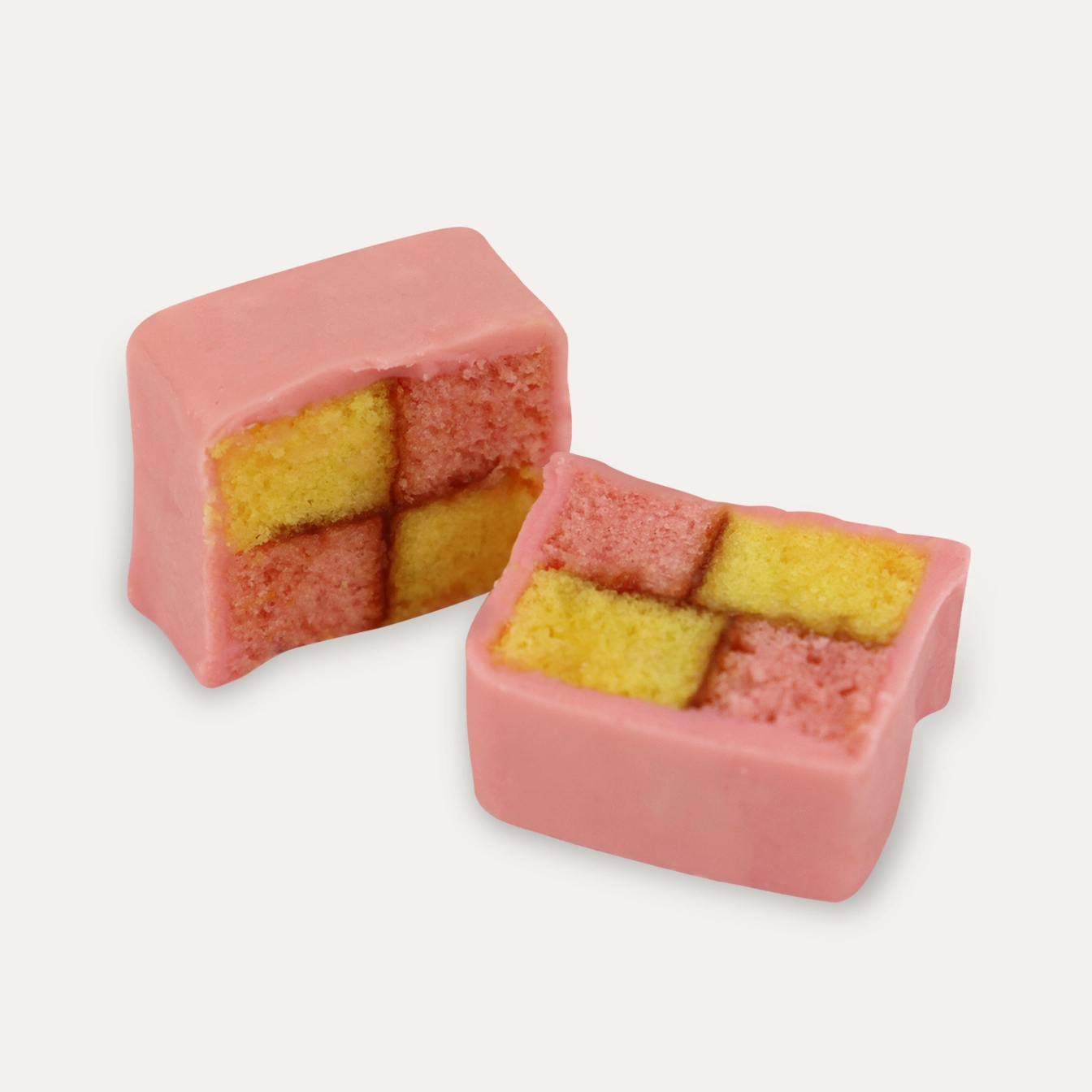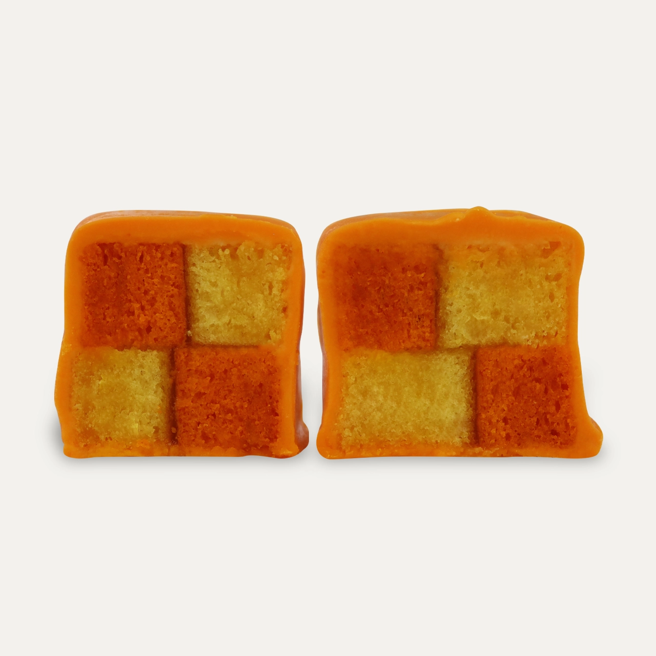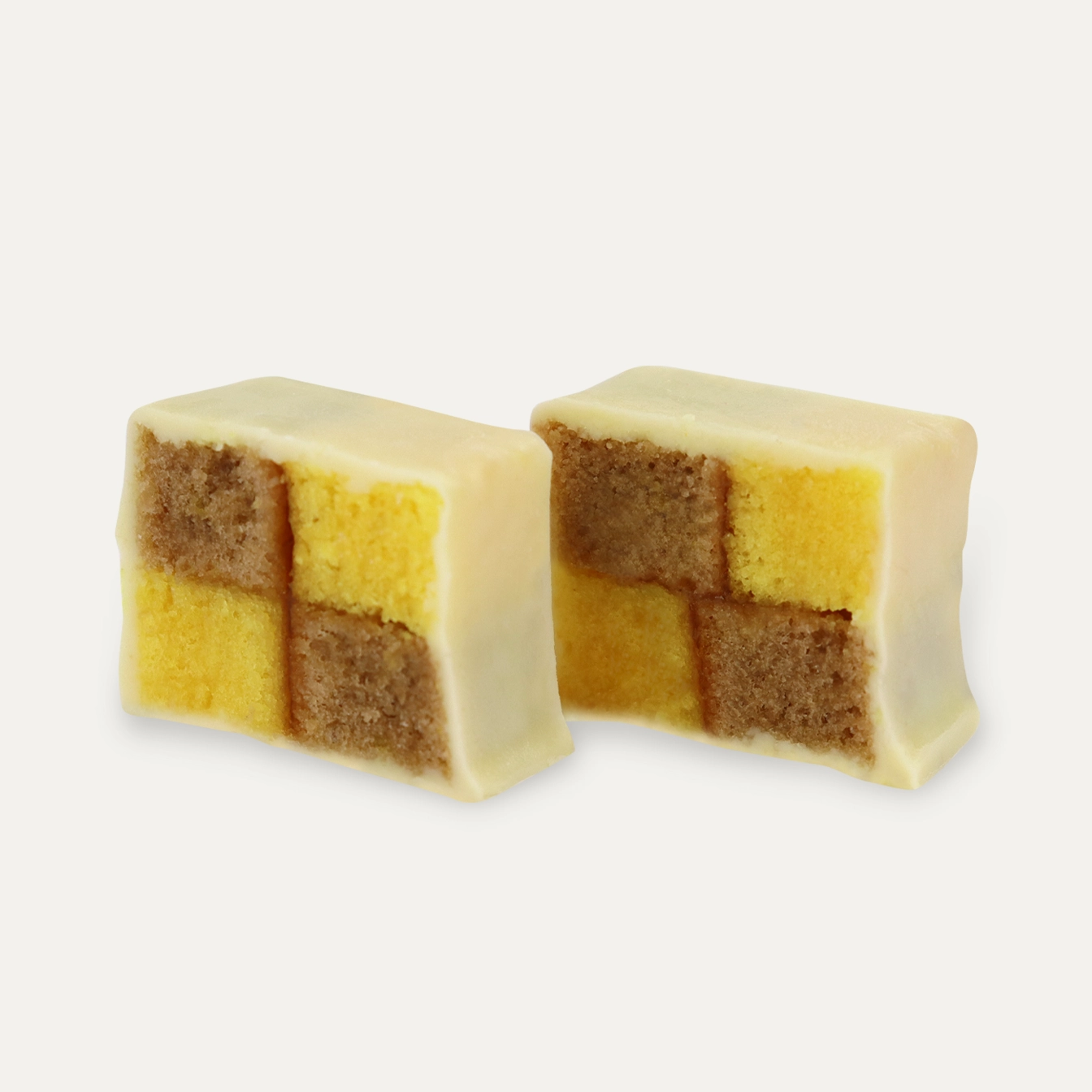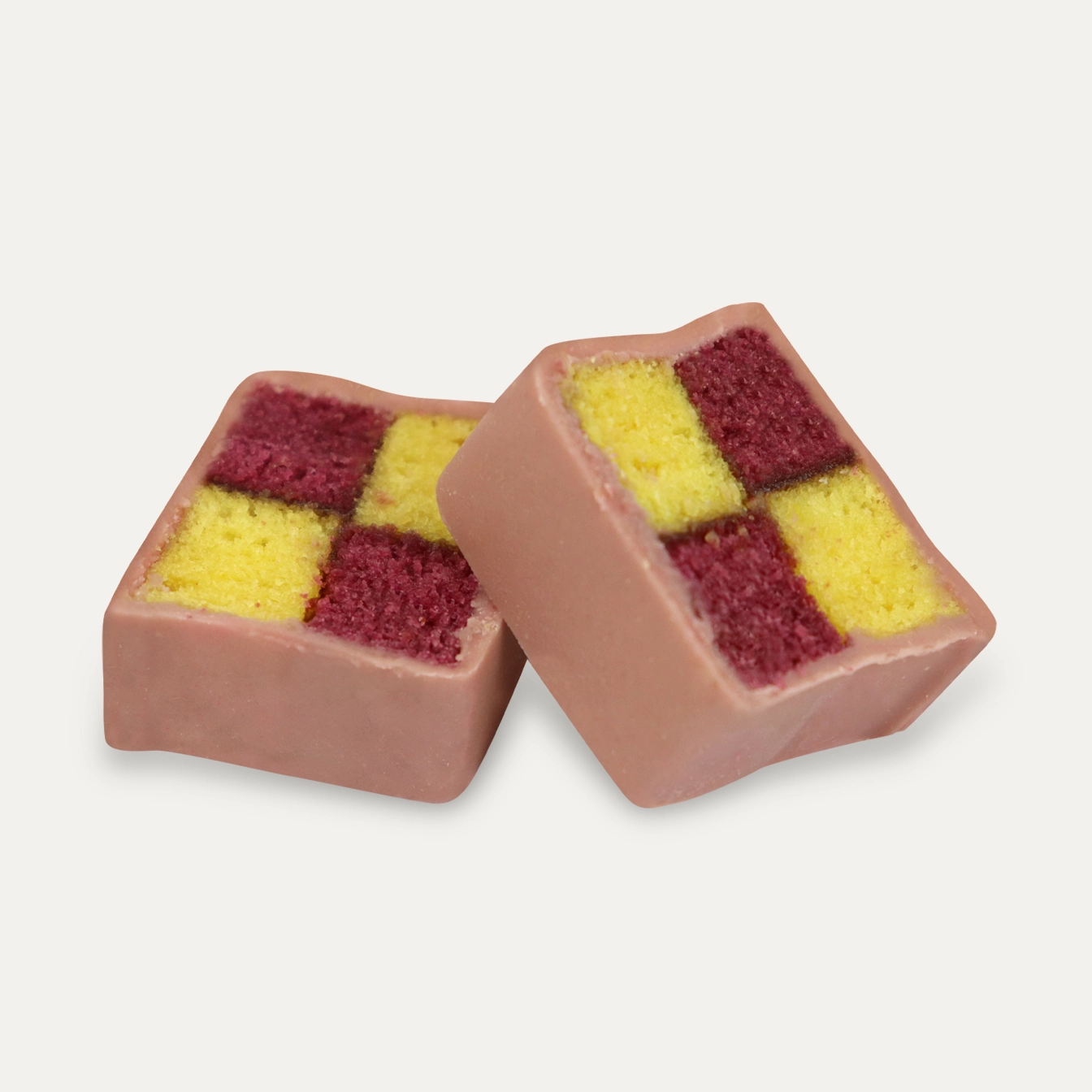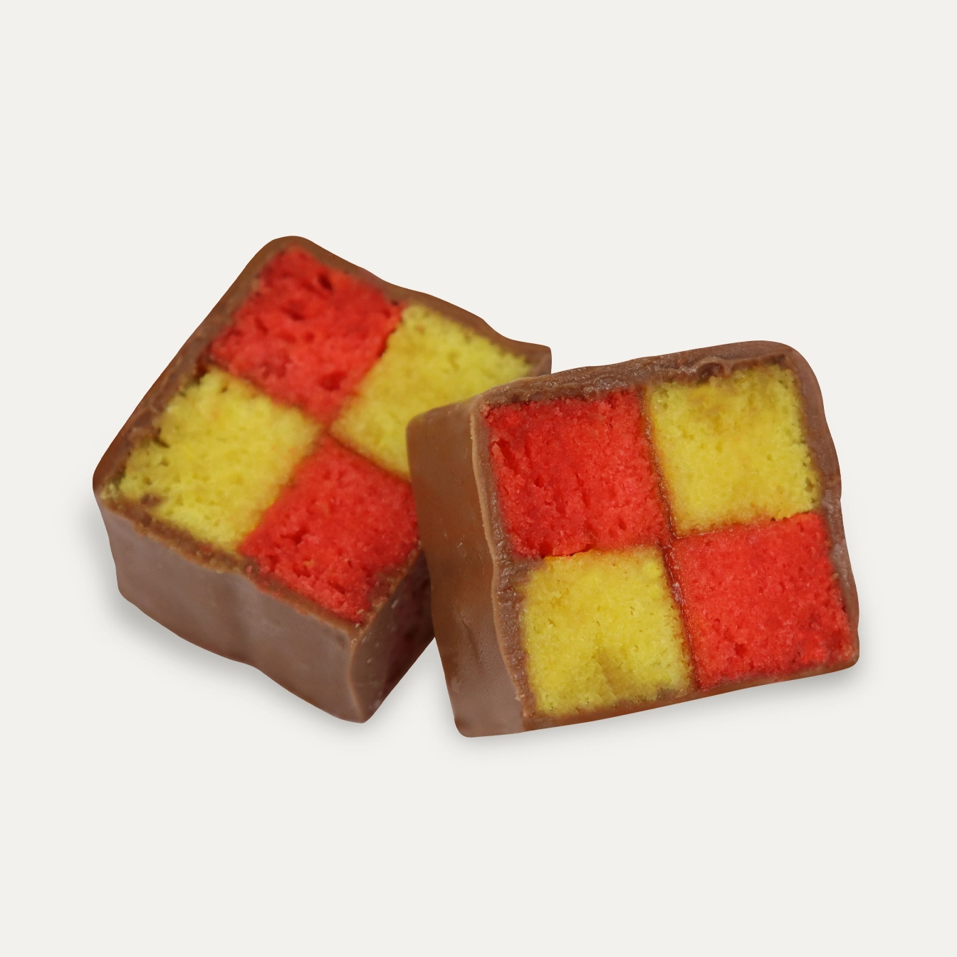 Mini cakes coated in chocolate and filled with jam - available in five varieties: orange with orange chocolate, blackberry with blackberry chocolate, apricot with white chocolate, apricot with milk chocolate, and strawberry with strawberry chocolate.