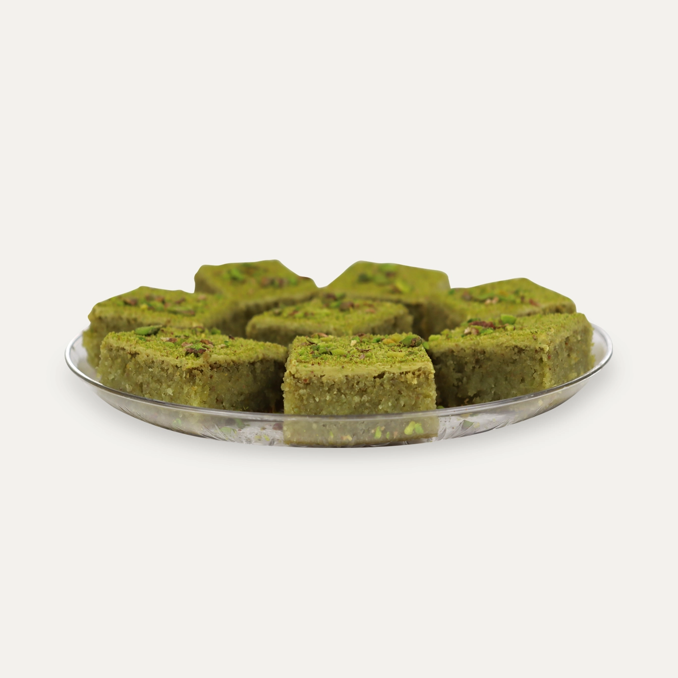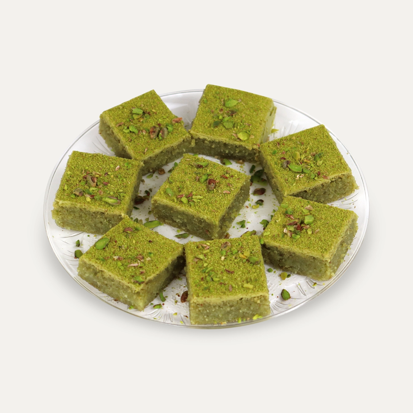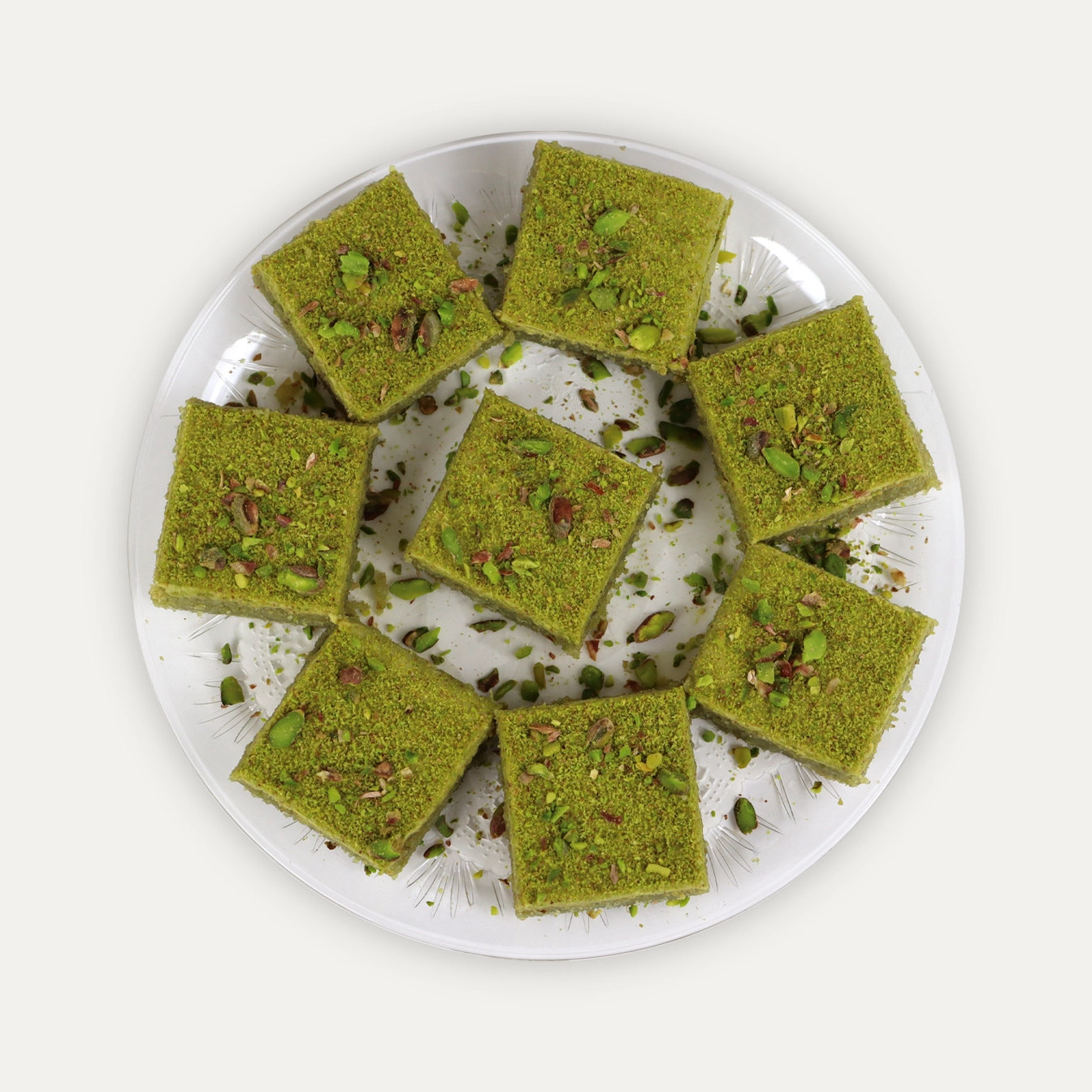 Semolina cake with a delicate pistachio flavor, topped with pistachios.