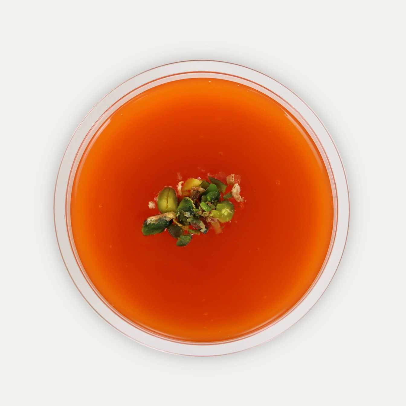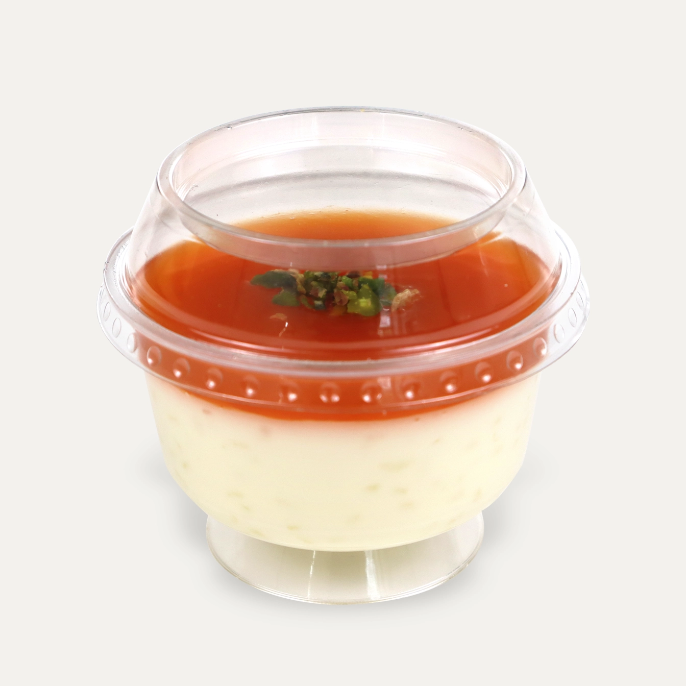 Homemade rice pudding topped with a fruity orange pudding layer and chopped pistachios.