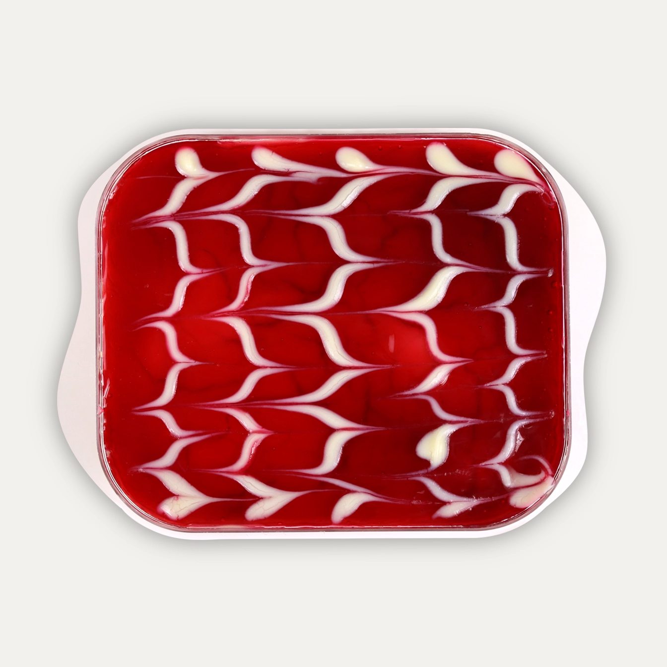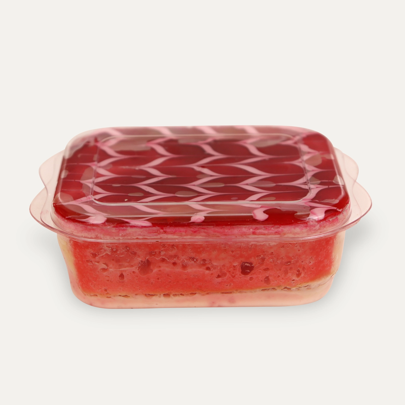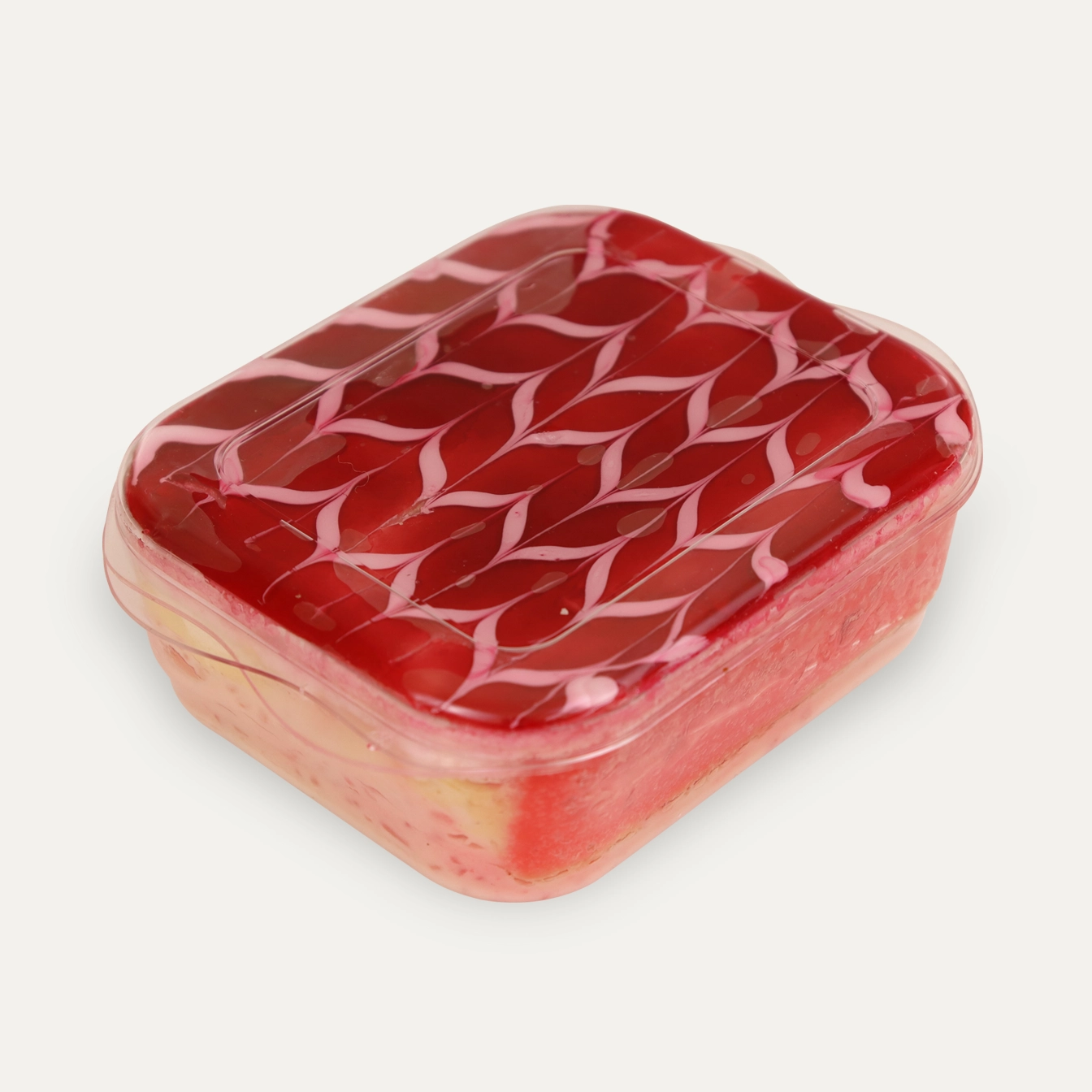 Light and airy cake batter with rice pudding, whipped cream and custard, glazed with a fine strawberry glaze.