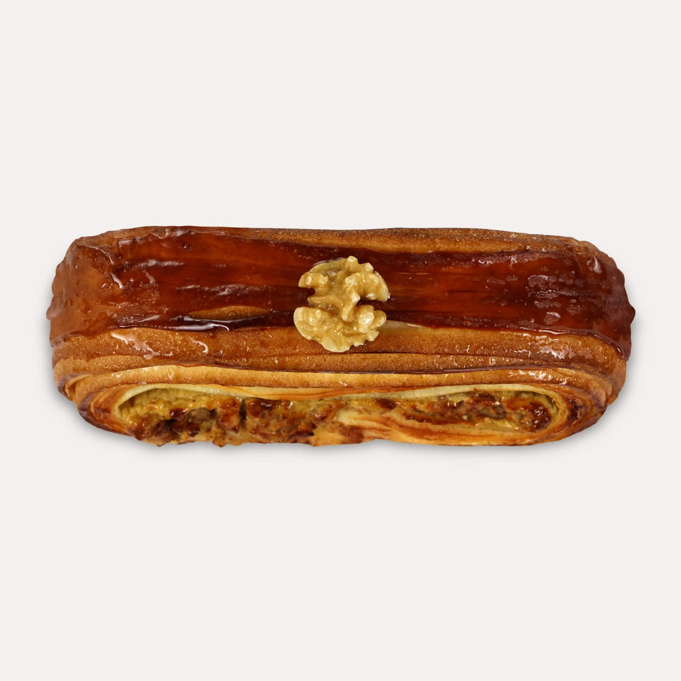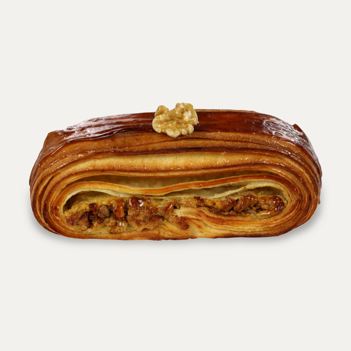Flaky croissant made with real butter, filled with chopped walnuts, cinnamon, and a delicate cream, topped with a walnut.