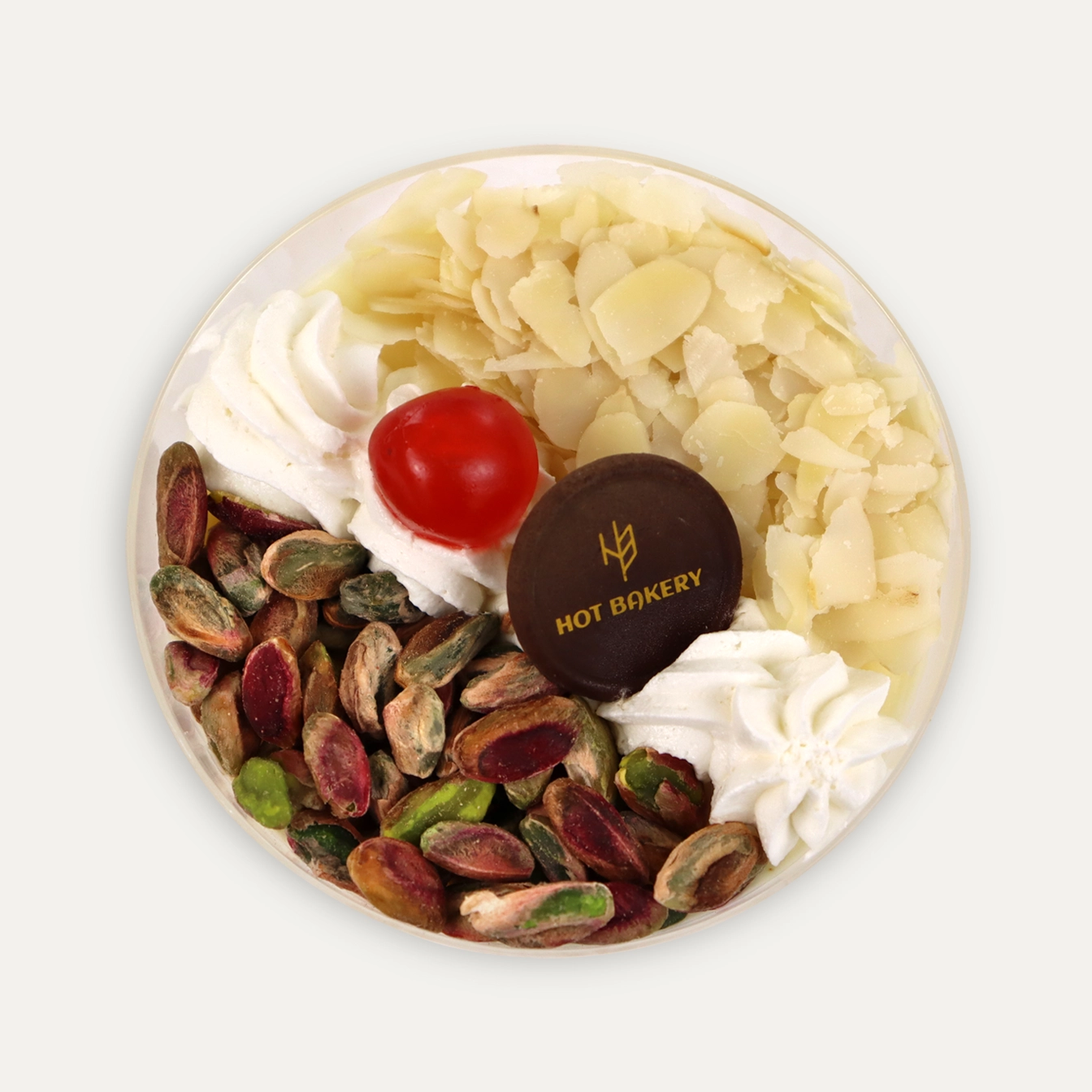 Fresh milk pudding refined with rose water, topped with whipped cream, pistachios, almonds, and a cherry.